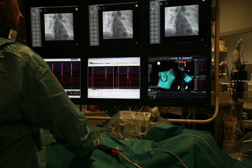 Un risque de complications locales au point de ponction (saignement, hématome, …) peut en outre survenir. Le meilleur moyen de les prévenir est d’éviter de bouger la jambe avant l’heure qui vous sera prescrite. Des complications plus graves sont exceptionnelles (de l’ordre de 0,1%). Ce sont par exemple des caillots de sang qui peuvent migrer dans la circulation, des saignements dans les enveloppes qui entourent le cœur, ou des répercussions sur les connexions auriculo-ventriculaires normales qui pourraient nécessiter la mise en place d’un pacemaker. Dans tous les cas, l’équipe cardiologique est formée afin de réagir de la manière la plus rapide et la plus appropriée possible. Pour éviter une complication, les cardiologues peuvent par ailleurs choisir d’interrompre une procédure, au risque qu’elle reste incomplète, plutôt que de courir un risque supplémentaire.
